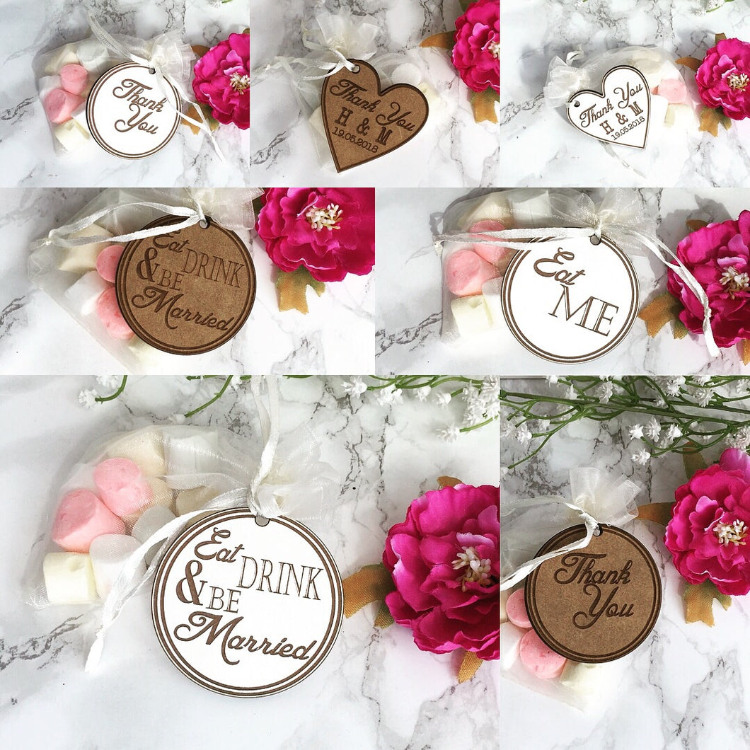 We have designed a range of tags that can be added to a variety of different favours- we have shown them as a tag on a bag of sweets- you could add yours to miniature bottles, soaps or candles