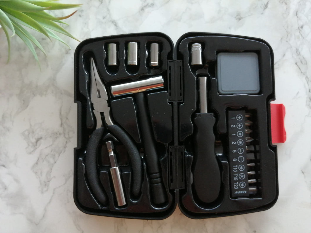 The tool kit contains a pair of pliers, a mini hammer, a mini measuring tape, a screw driver handle with interchangable heads and sockets as well as an extender head. everything you will need for your DIY jobs.