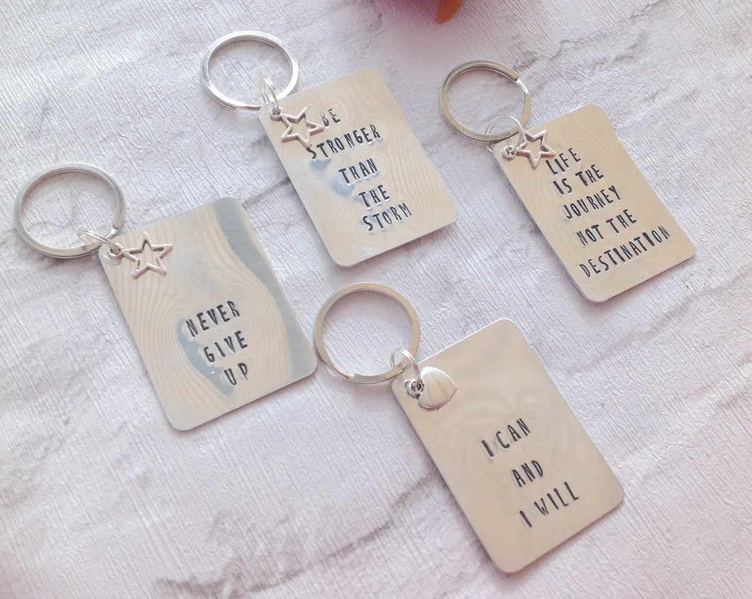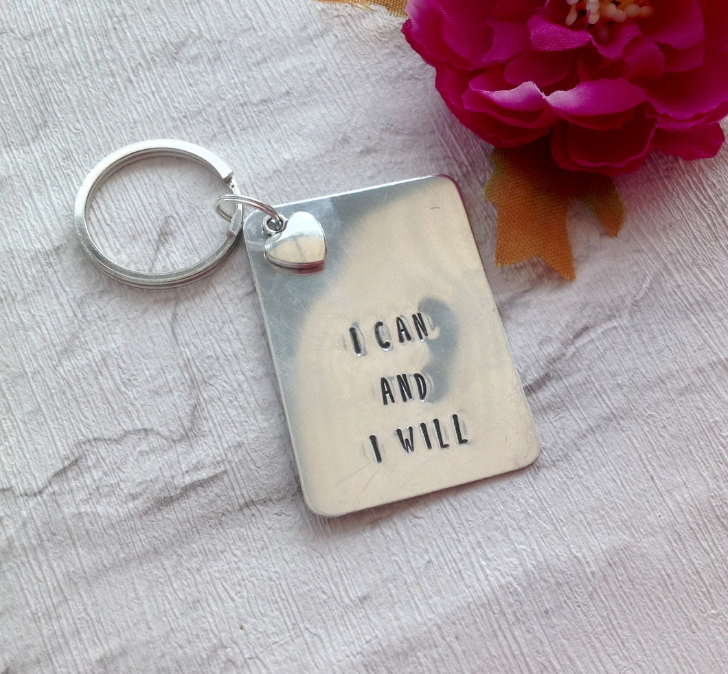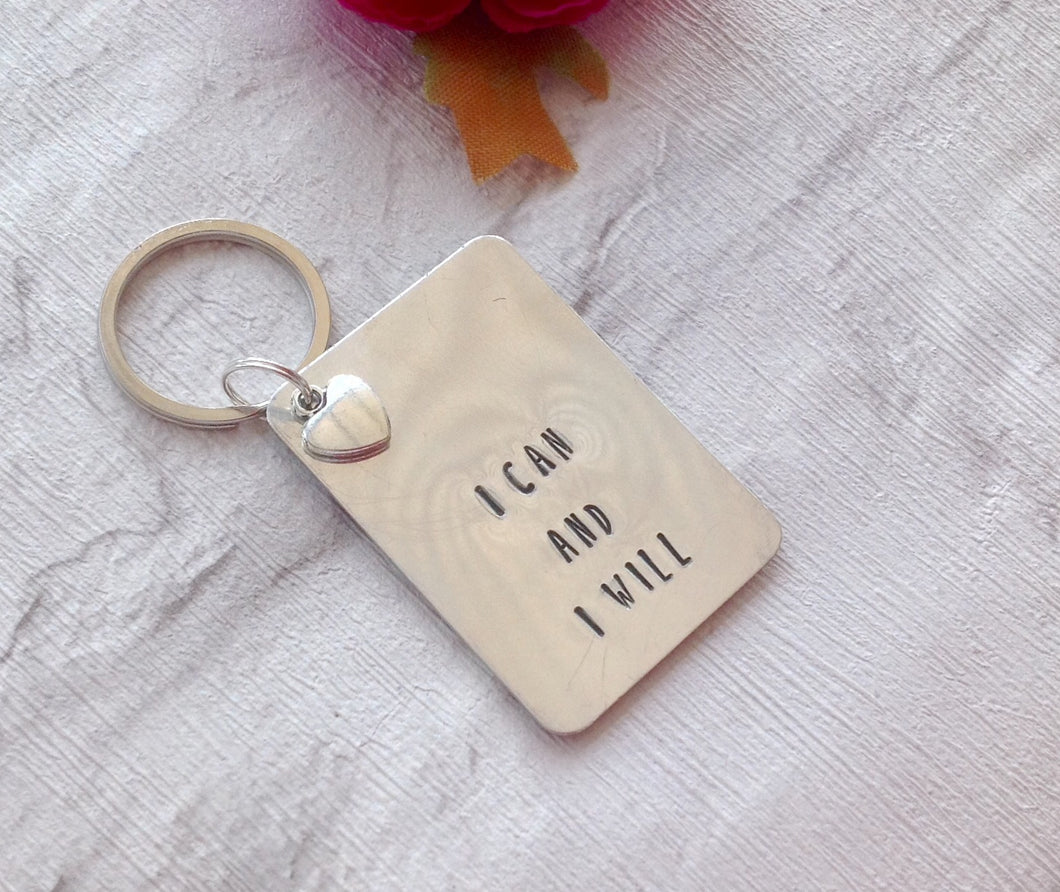 I can and I will - positive mantra- hand stamped metal keyring with a star charm.